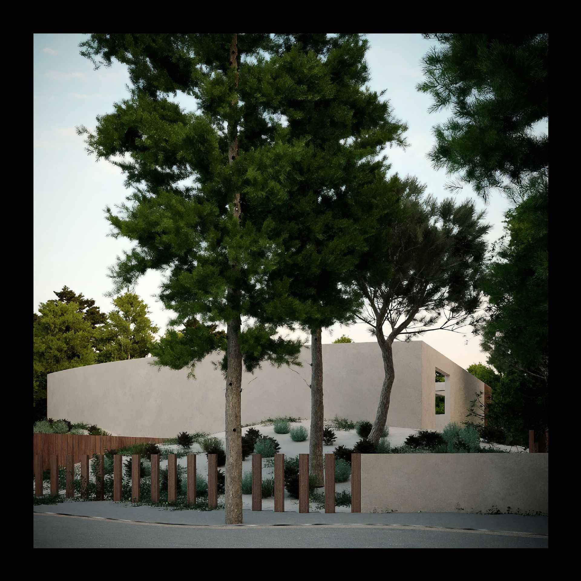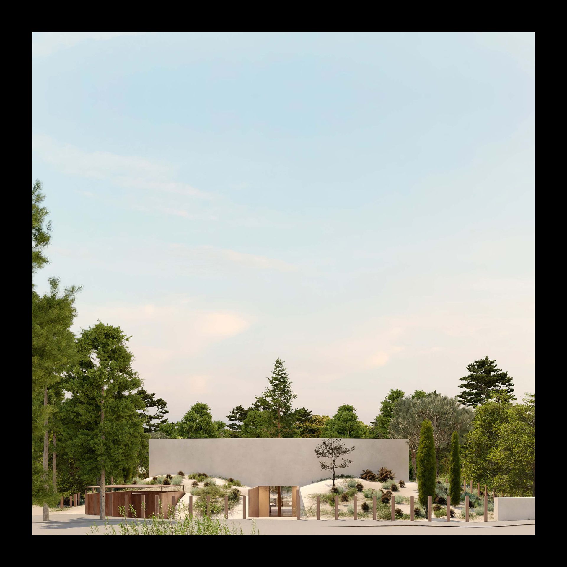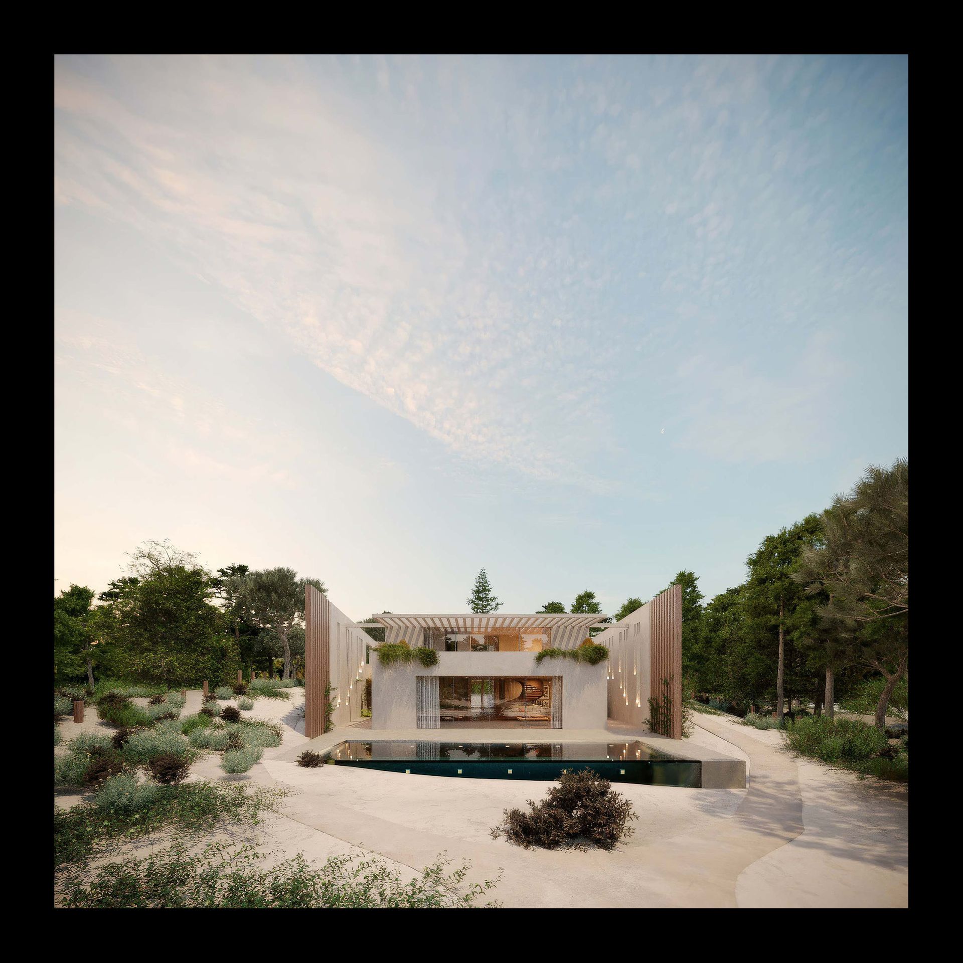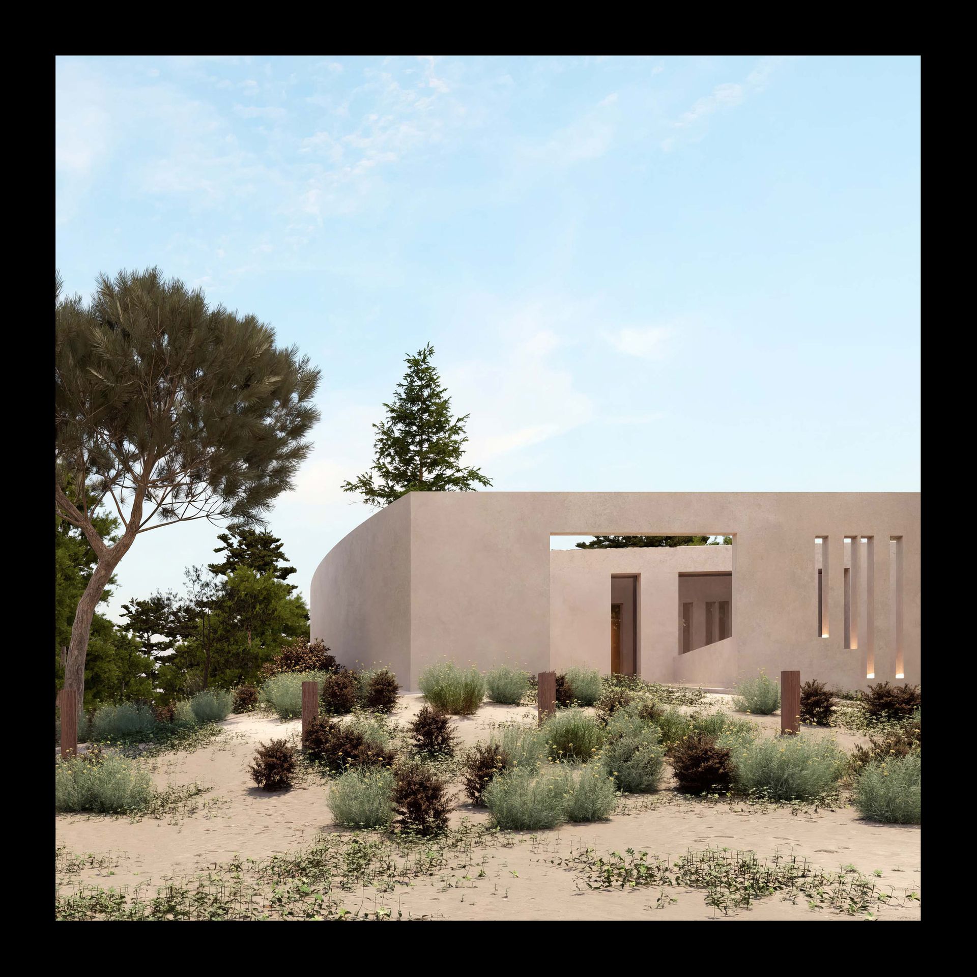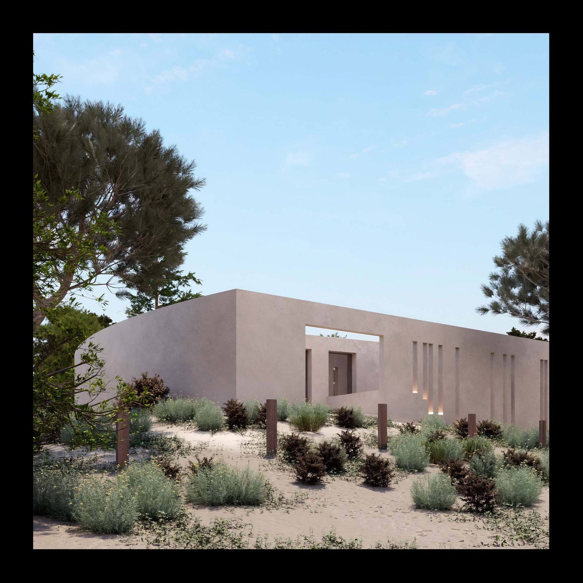 A moradia situa-se num terreno de dunas e pinhal em Tróia, no concelho de Grândola. Na península onde o oceano encontra a serra, a moradia nasce como uma extensão natural do território, inspirada pela teatralidade subtil do lugar. O projecto articula o terreno arenoso, os pinheiros bravos e o reflexo da vegetação na piscina, criando um verdadeiro anfiteatro natural. A casa desenvolve-se desde a rua até à piscina, culminando na vista da Serra da Arrábida, propondo um percurso onde o quotidiano se entrelaça com a contemplação. ⠀⠀⠀⠀⠀⠀⠀⠀