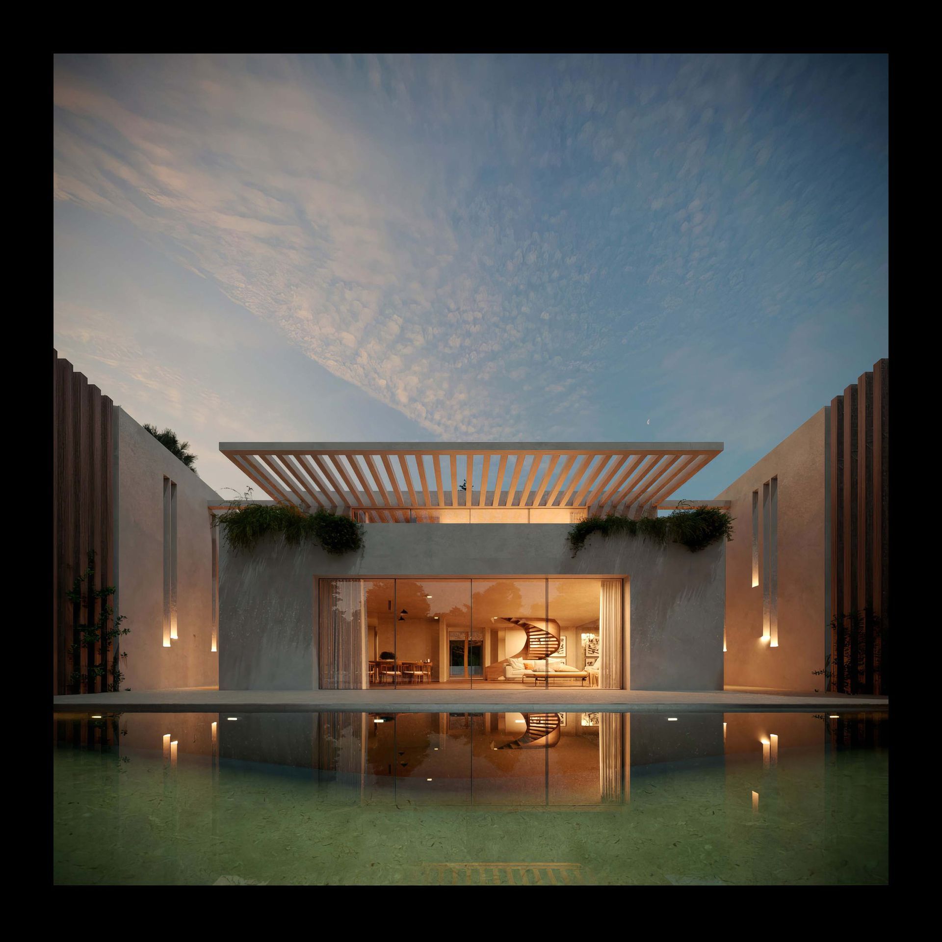 A piscina de transbordo actua como espelho da paisagem e ponto focal, prolongando o espaço social e convidando à contemplação. A moradia adopta soluções de eficiência energética e preservação ambiental, harmonizando-se com o ecossistema local.